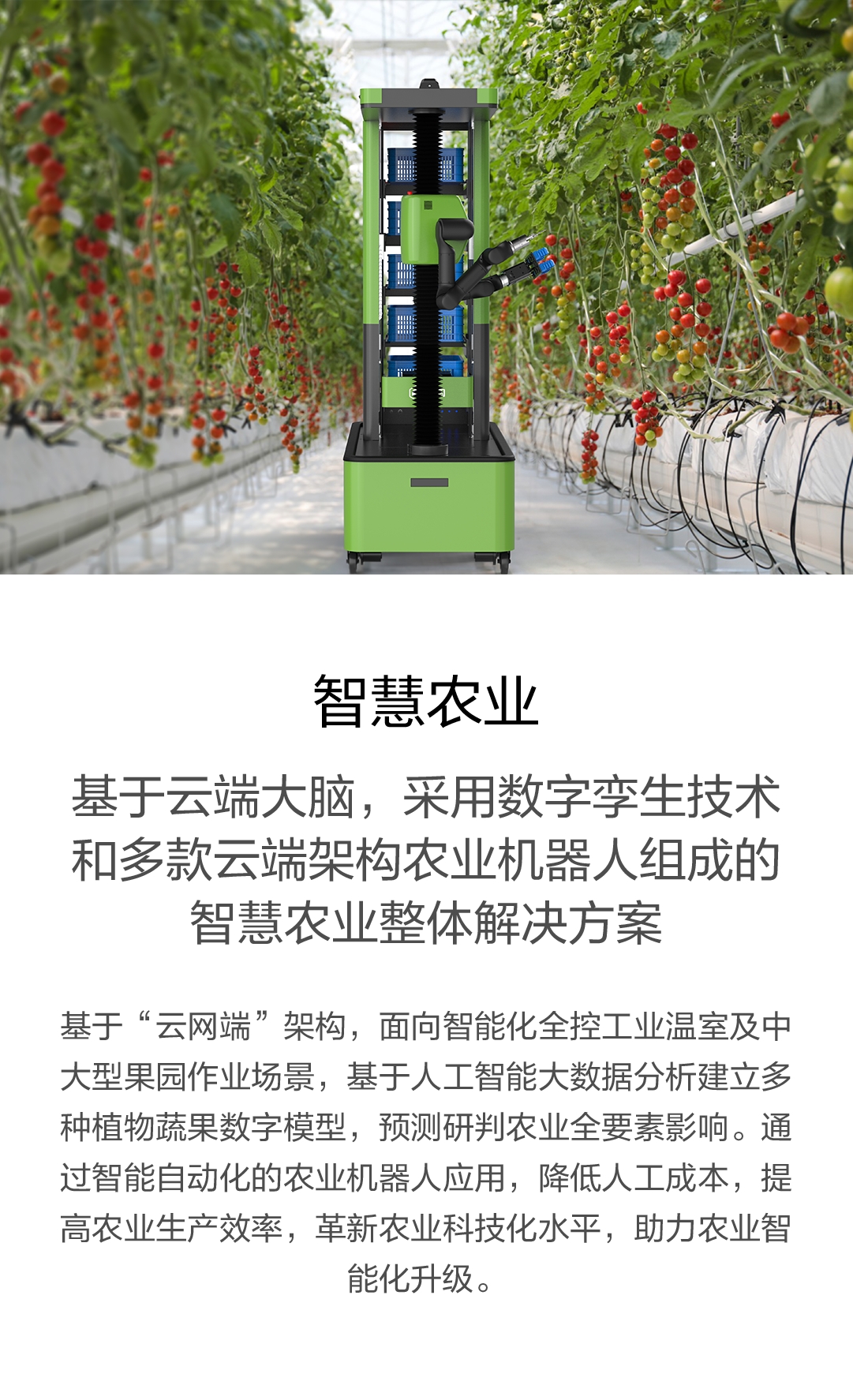 基于云端大脑,采用数字孪生技术和多款云端架构农业机器人组成的智慧农业