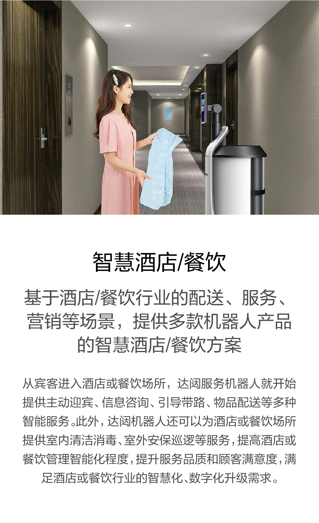 基于酒店/餐饮行业的配送、服务、营销等场景,提供多款机器人产品的智慧酒店/