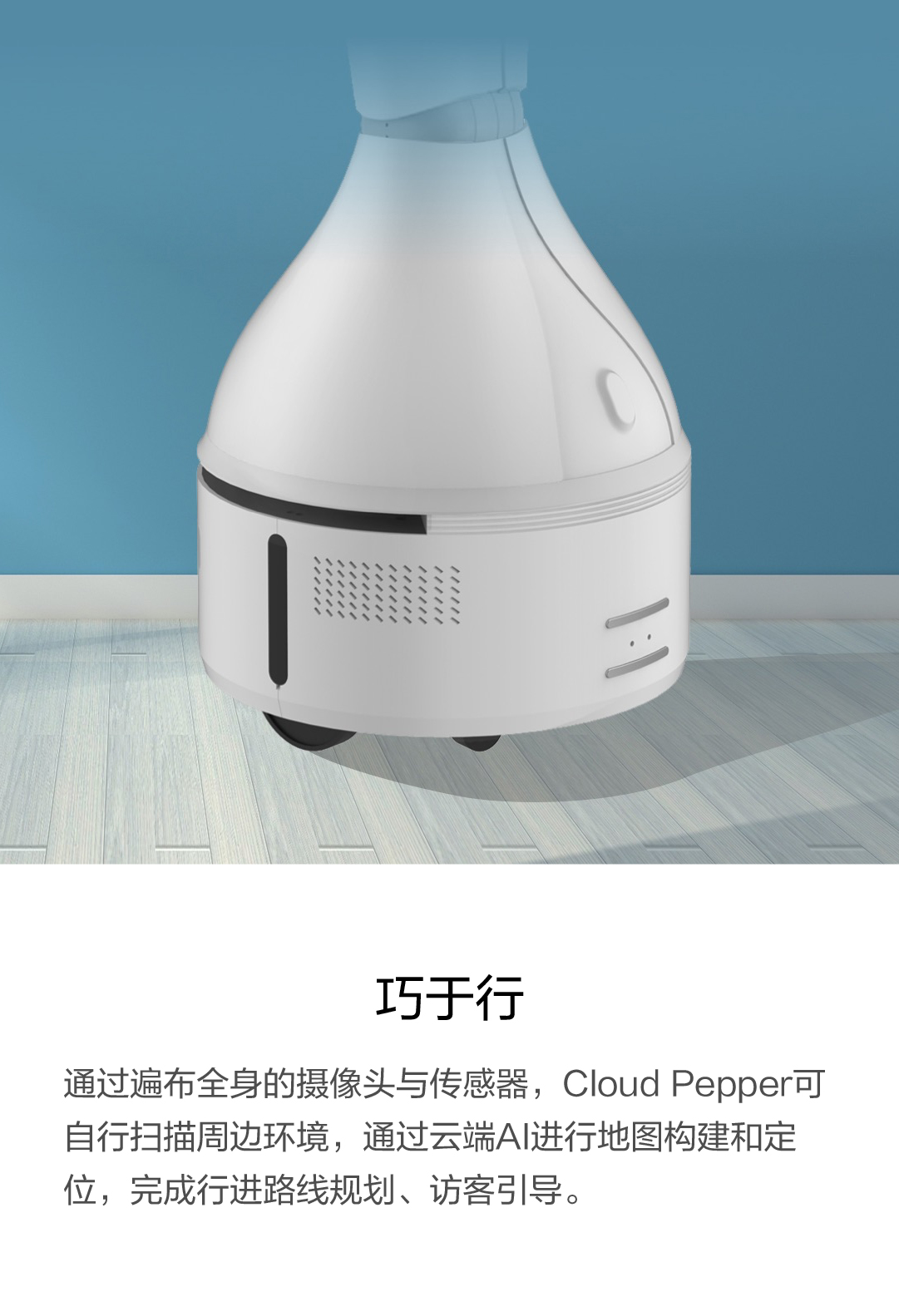 通过遍布全身的摄像头与传感器,Cloud Pepper可自行扫描周边环境,通过云端